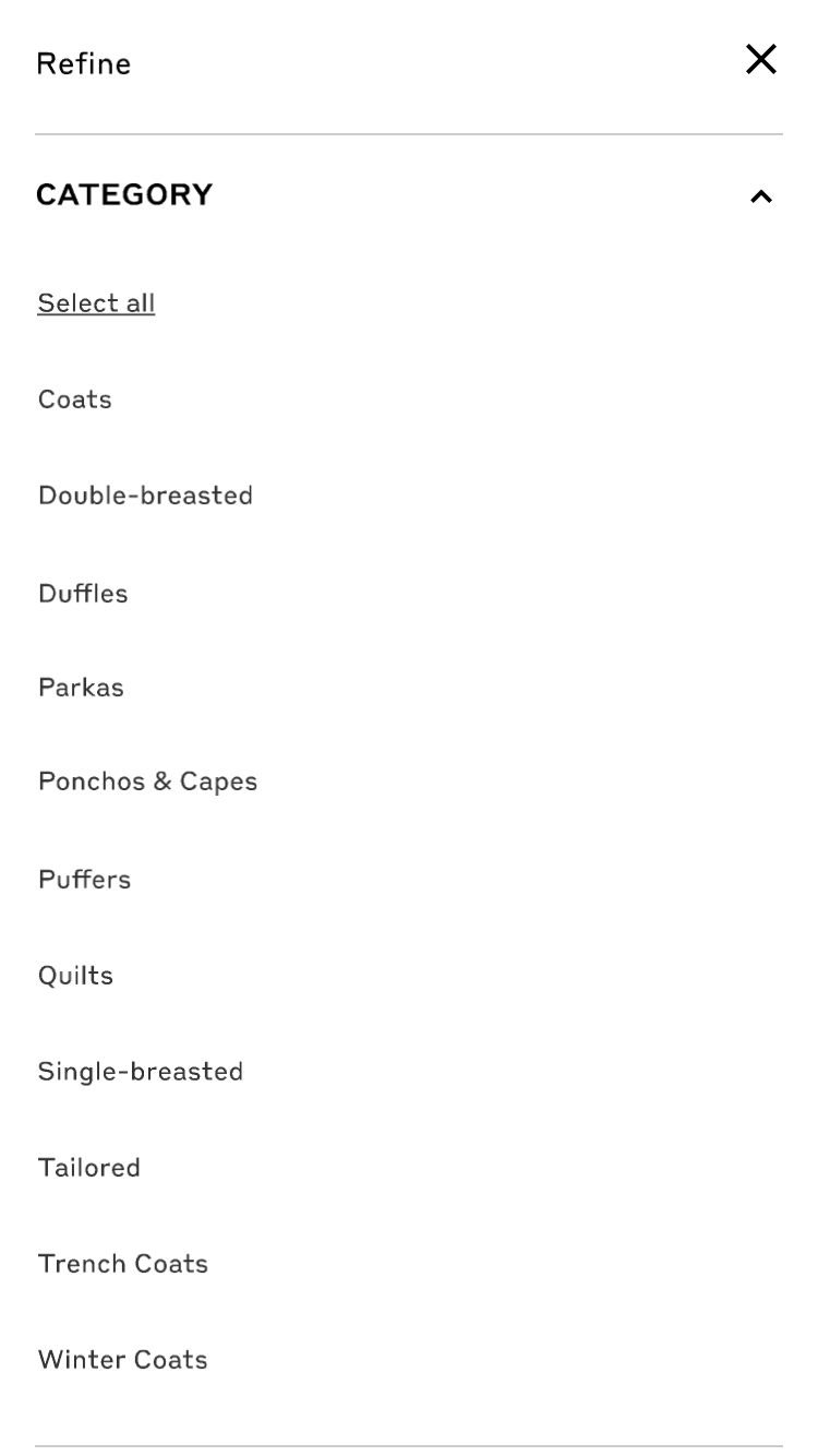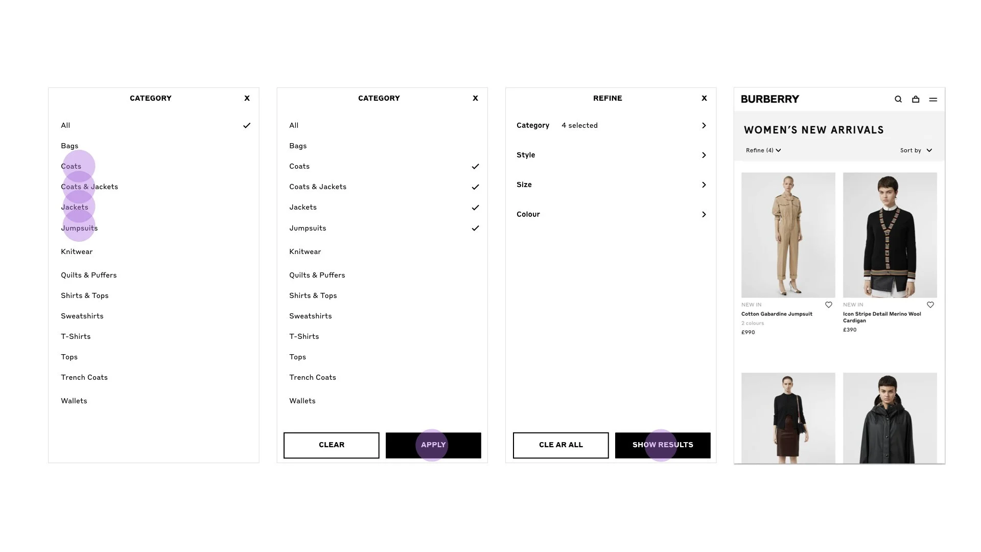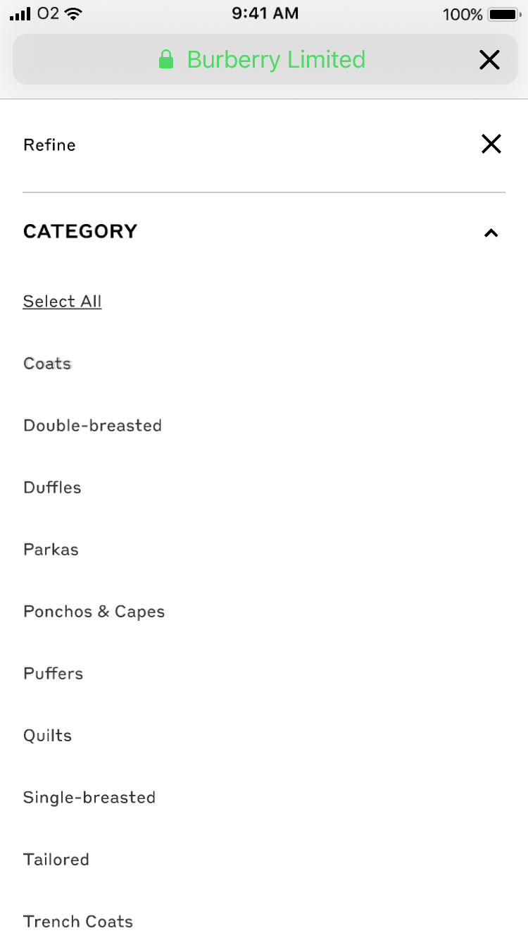As part of the website replatforming, the brief was to optimise the current adaptive filtering experience on Burberry.com, making it responsive, and drive more Product Listing Page (PLP) traffic to purchase.
