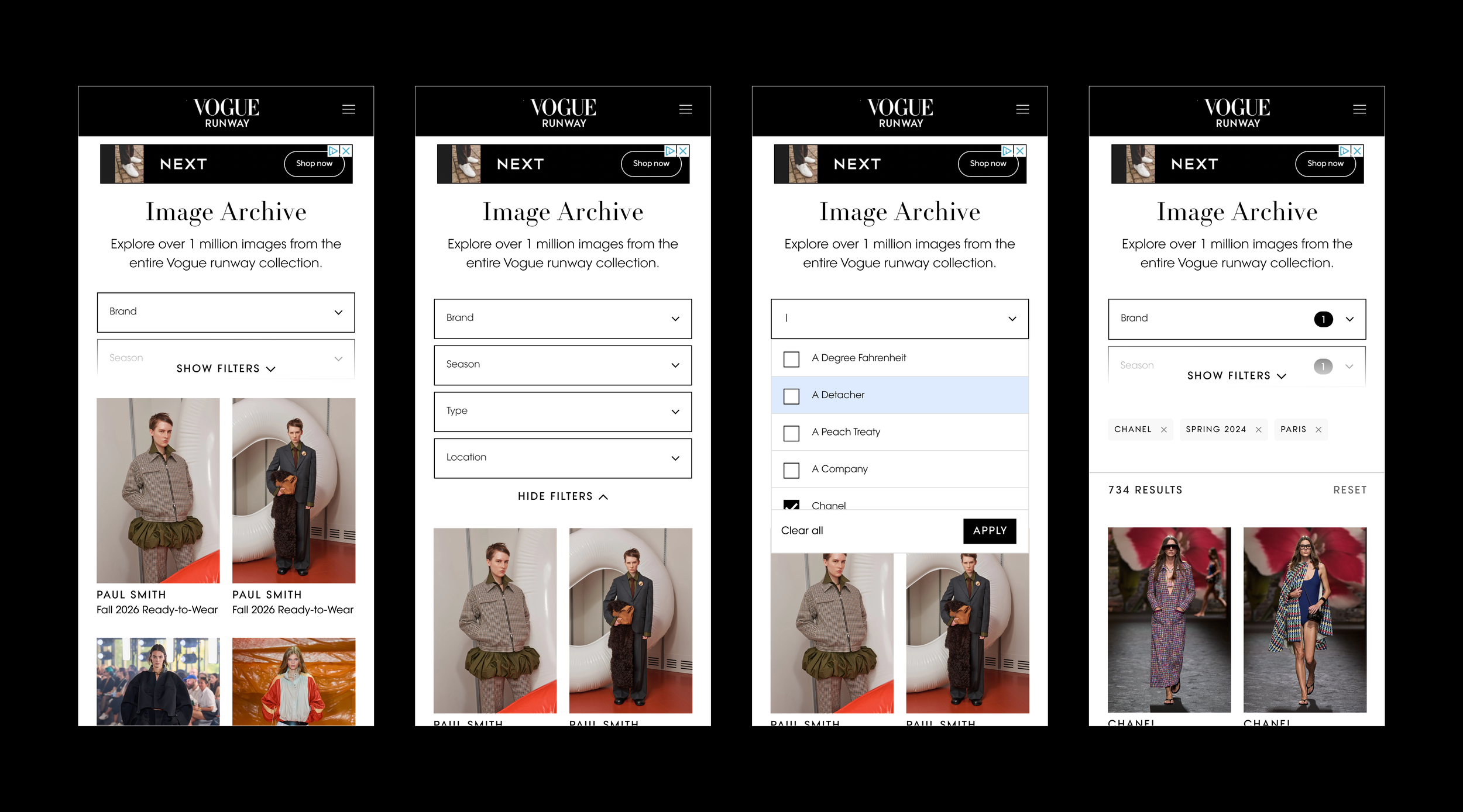 Working with Content Design, I workshopped options and steered stakeholders to finalise the new title “Image Archive”, which reflected the depth of the Vogue Runway image archives, without suggesting open text search. This also sat well in the Runway navigation, and was placed first to ensure visibility on mobile and distance from existing site search.