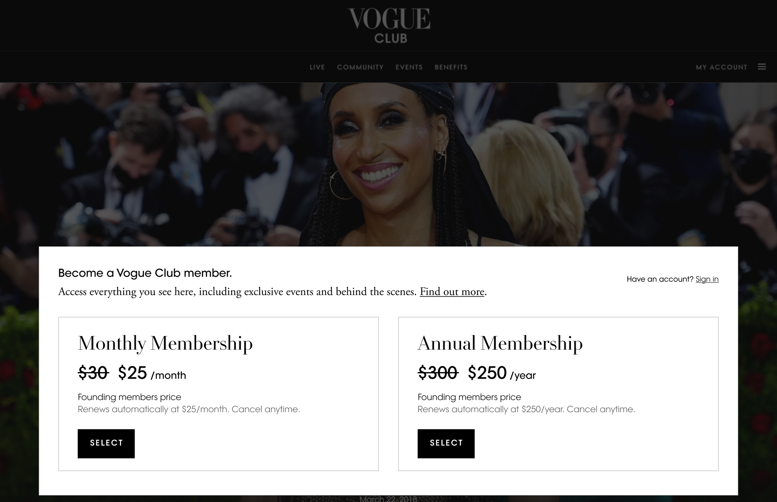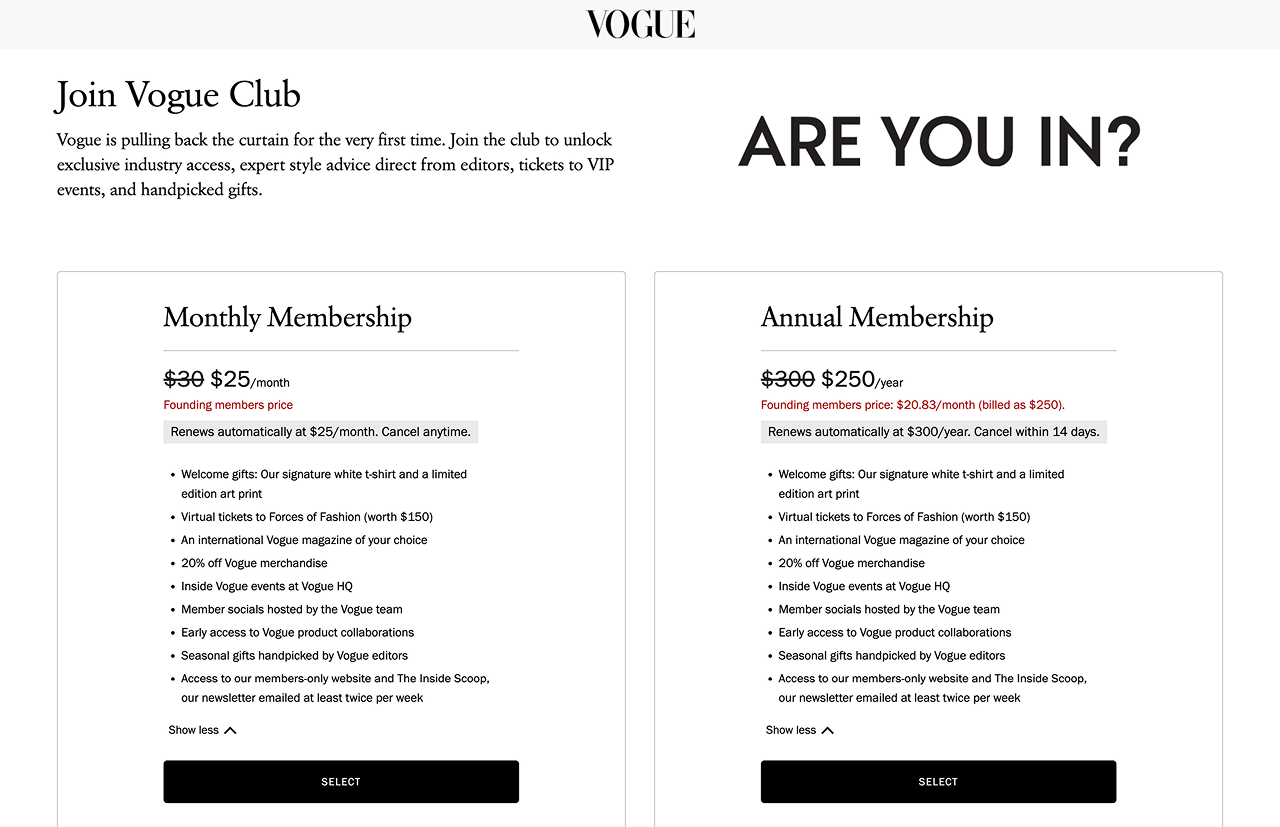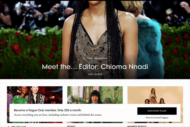 Rather than directing users to the membership marketing page, unlocking the Vogue Club Hub page but locking further interaction allows potential subscribers to understand the membership experience before signing up.